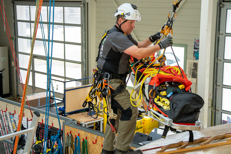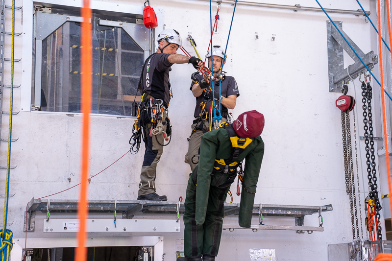An diesem Morgen gibt es nur wenige Fragen. Auch die im Anschluss auf dem Tablet absolvierten Theorietests scheinen keine Probleme zu bereiten. Daher wird es Zeit, nach der PSA zu greifen und rüber in die Ausbildungshalle zu wechseln. Hier, wo die Seile von der Decke hängen, überall Karabiner und anderes Material fein säuberlich in Regalen und auf Materialwägen geordnet sind, geht der Rest des Tages über die Bühne. Es werden verschiedene Szenarien geübt, denn am Prüfungstag müssen die Teilnehmenden  unter anderem in der Lage sein, einen improvisierten Klettergurt zu erstellen, Sicherungspunkte zu setzen, mit einem Dreibeinstativ zu arbeiten, Seilzugsysteme zu bauen, um daran Abzuseilen. Dabei sind die Knotentechniken noch die kleinste Herausforderung.