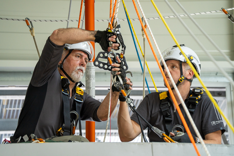 Damit für die Prüfung alles klar ist, geht Patrice mit den Teilnehmern schnell in eine erste Übungsphase. Dafür werden verschiedenfarbige Seile mit Karabinern zu einem ersten eindrücklichen Aufbau kombiniert. Unten hängt ein schweres Gewicht. Es fallen Begriffe wie Norvegian Reeve und English Reeve. Die Experten wissen sofort, von was die Rede ist. Schnell herrscht ein reger Austausch. Das Augenmerk liegt auf den Details. «Generell überprüfen wir jedes System hinsichtlich seiner Redundanz. Alles muss doppelt vorhanden sein, und wenn dies nicht der Fall ist, dann müssen wir dafür sorgen, dass wir Redundanz schaffen können. In einem Ernstfall kann das überlebenswichtig sein», so Patrice. Er weiss, wovon er spricht. Hat er doch selbst die Ausbildung zum Industriekletterer auf den Levels 1, 2 und 3 absolviert. Daraufhin hat er als Industriekletterer gearbeitet, ehe er 2015 angefangen hat, IRATA-Kurse für Altimum Formation SA zu geben. Einst war er gar selbst bei einer Bergung im Tessin beteiligt, als ein Canyoning-Teilnehmer gerettet werden musste.